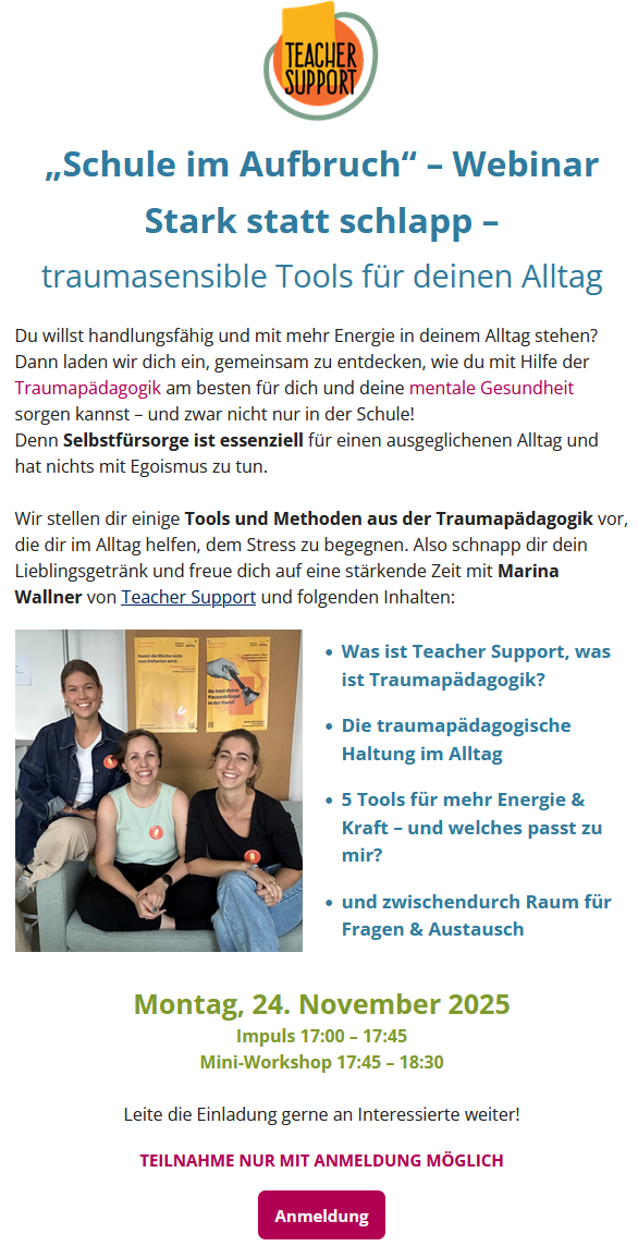 Sa., 15. November 2025Schule im Aufbruch - Tag, Vorarlberg 8:30 - 16:30Anmeldung
