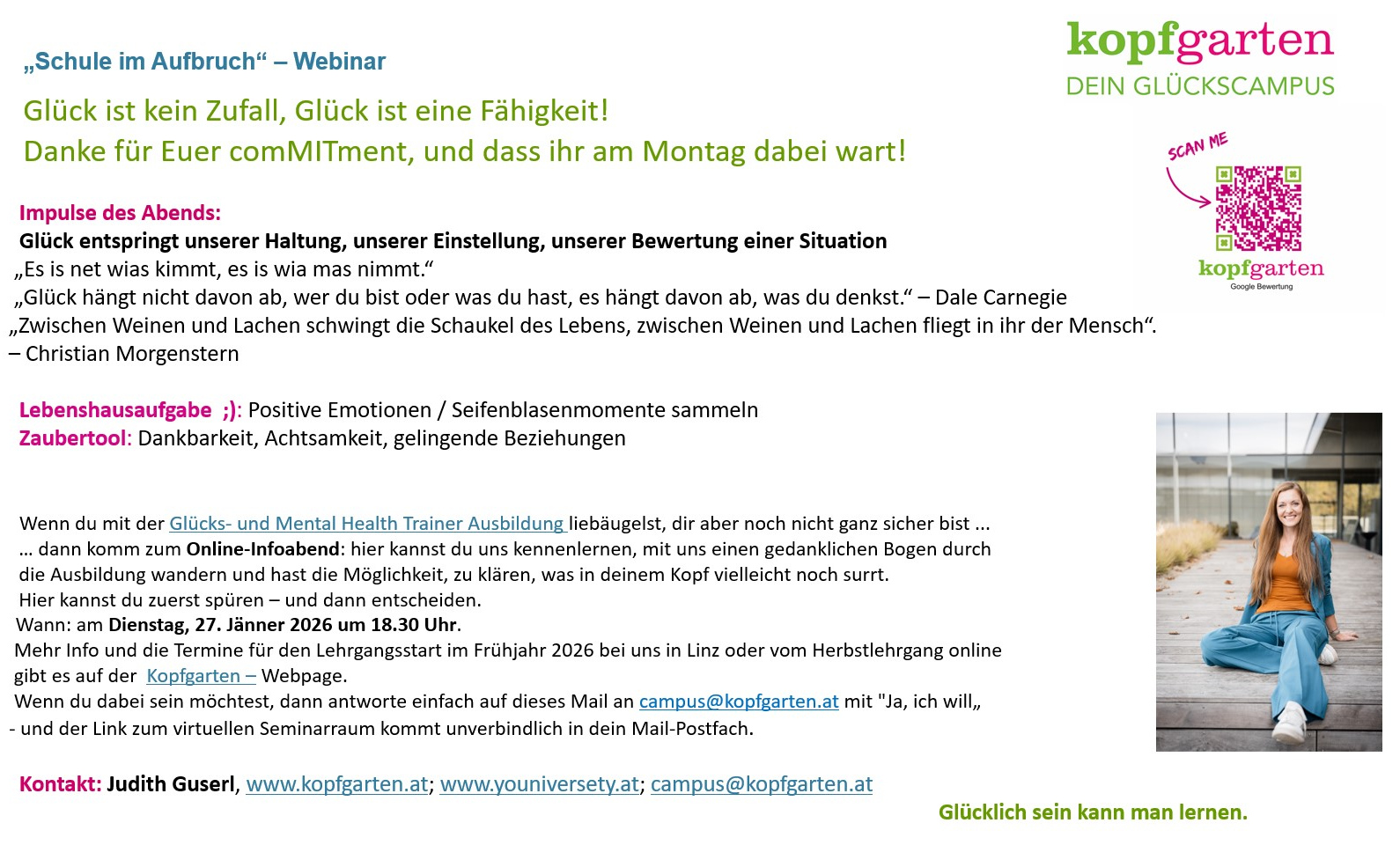 Referentin: Judith Guserl, Gründerin von Kopfgarten — Dein Glückscampus und der Bildungsinitiative kopfgarten@school (GLÜCKSKIND, GROW, MentalHealthMatters)